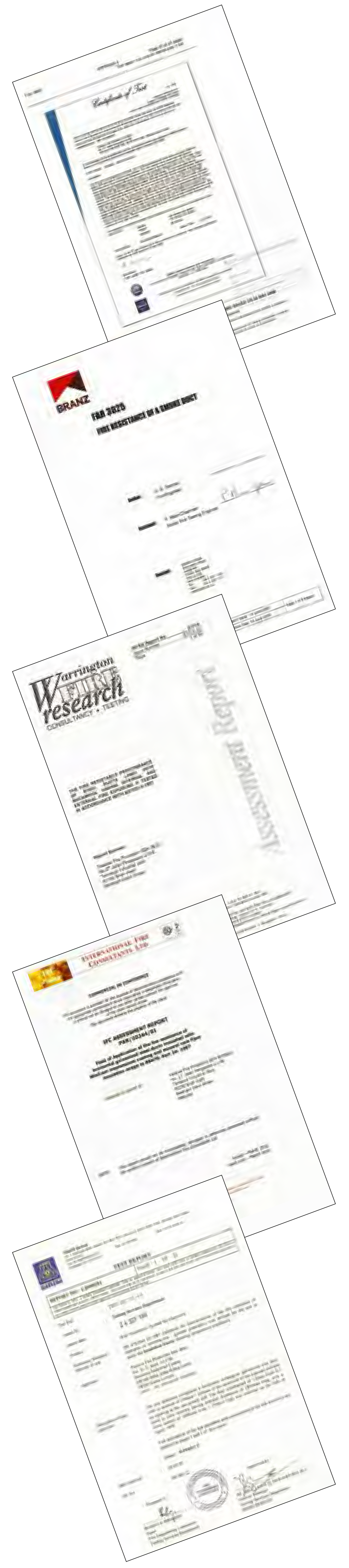WinDuct® are tested and complied with the following standards: 1. Laboratory : C.S.I.R.O Australia Test Report | FSH 0993 | : | Fire Resistance Test on Two Horizontal Ducts (Duct A & Duct B) to B.S 476 Part 24 | Assessment No. | FCO-2282 | : | Assessment on 2 and 3 sided duct installation | | | - | Oversize duct | | | - | 60 and 120 minutes Insulation | | FCO-2387 | - | Assessment on Stress Level Limits for the Support | | FCO-2385 | - | Assessment on use of DW144 Duct Construction Standards | | FCO-2439 | - | Assessment on WinCoat™ use on St. Steel duct to B.S.476 part 24 | | FCO-2220 | - | Assessment on duct tested on A.S. 1530.4 to the performance of the test if test conducted with B.S. 476 Part 24 | | FCO-2825 | - | Assessment on use as Vertical Ductwork | 2. Laboratory : BRANZ, New Zealand Test Report | FR 2572 | : | Fire Resistant Test to A.S. 1530.4 Duct A and Duct B | Assessment No. | 99/1425 | - | Assessment on 2 and 3 sided duct | | | - | Assessment on Increase of Duct Size | Test Report | FP2298 | : | Fire Resistance Test to A.S. 1530.4 on Duct A and Duct B for Flat Over Duct | Assessment No. | 96/952 | - | Report on Wall Penetration of Ducts | | FAR 2168 | - | Assessment Report to increase the duct size to 10,000mm wide | | FAR 2132 | - | Assessment on The Fire Resistance of An Air Transfer Duct | | FAR 2694 | - | Assessment Report to B.S.476 Part 24 on Flat Over Duct | Test Report | FR5887 | : | Fire Resistance of an external exposure Duct A and Internal exposure Duct B | 3. Labotratory : Warrington Fire Research Test Report No. | WFRA 21214 | : | Assessment of Duct on tests A.S. 1530.4 and B.S 476 : Part 24 on Duct A (External Fire) and Duct B (Internal Fire) | WFRS No. | SC2436 | : | The Fire Resistance Performance of Duct Assemblies | 4. Laboratory : International Fire Consultants Ltd, England | PAR/10244/01 | : | Assessment Report of WinDuct® to B.S. 476 Part 24 :1987 with insulation | | FSB551 | : | Product Certification Scheme on Intumescent Coating and WinCoat™ | 5. Laboratory : SIRIM, Berhad Malaysia Test Report No. | 2002KL1105 | : | Application properties to MS 134, viscosity ASTM D2196 non ventilate matter to MS 133 Pt B2 and specify gravity MS 133 Pt A12 | | CB990292 | : | Report on test for Duct Insulation with Rockwool | | KL980127 | : | Cross Cut Adhension Test to ASTM 3359 | | SM971153 | : | Wall Penetration System for Ductwork to B.S. 476 Part 24 | | KL970607 | : | Resistance to Fungal Growth to MS 137 and MS 134 | | SM961658 | : | Resistance to Impact Test to B.S.5669 | | SM961447 | : | Non-combustible test to (Class'O') under B.S. 476 Part 6 & 7 | | SM961561 | : | Non-combustible test to (Class'O') under B.S. 476 Part 6 & 7 | | 2012KL0627 | : | Standard Practice for Determining Volatile Organic Compound (VOC) Content | | 2015CB1962 | : | Standard Test Method for Pull-off strength | | 2015FE0447 | : | Fire Test to BS476 Part 24 up to 400°C | | 2015FE0301 | : | Fire Test for fire rated smoke extraction ductwork system (HVAC) | 6. Laboratory : FURGO Technival Services `Ltd. Hong Kong Test Report No. 033238ST32534 | : | Impact Test on BS 5669 Part 1:1989 | 7. Laboratory : Universidade De Macau Test Report No. 2006-FRT79 | : | Test on WinDuct® for 2 Hours Fire Rated Duct | 8. Laboratory : TUV SUB PSB Pte Ltd, Singapore Test Report No.7191050375 - MEC 12/1-MHA | : | Tendency of surface of material to support spread of flame under BS476 Pt 7:1997 | Test Report No. 7191050375 - MEC 12/2-YWA | : | Method of test for fire propagation for product BS 476 Pt 6:1989 | |